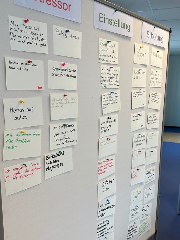 Mein Ziel ist es, Stress nicht nur theoretisch verständlich zu vermitteln, sondern Zusammenhänge zu eigenen Erfahrungen der Teilnehmenden deutlich werden zu lassen. Durch gezielte Übungen, Experimente und praxisnahe Reflexionen entstehen somit für die Teilnehmenden echte AHA-Momente. Sie erkennen unmittelbar Zusammenhänge, verstehen ihre eigenen Stressmuster und dürfen Strategien entwickeln, die direkt im Berufsalltag anwendbar sind.